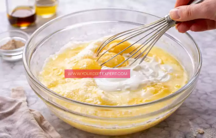 Start by whisking eggs until smooth, then add Greek yogurt, vanilla extract, and sweetener. The mixture should look creamy and uniform.