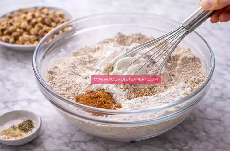 In a separate bowl, whisk together oat flour, protein powder, baking powder, baking soda, cinnamon, and salt. This step prevents clumping and uneven rise.