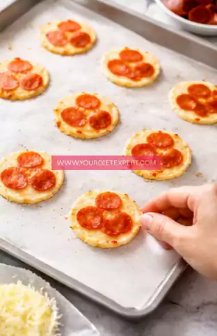 - Place a few pieces of turkey pepperoni on top of each cheese portion. Lightly press them down with your fingers so they stay in place while baking. Avoid pressing too hard, as you still want the cheese to rise and crisp around the edges.