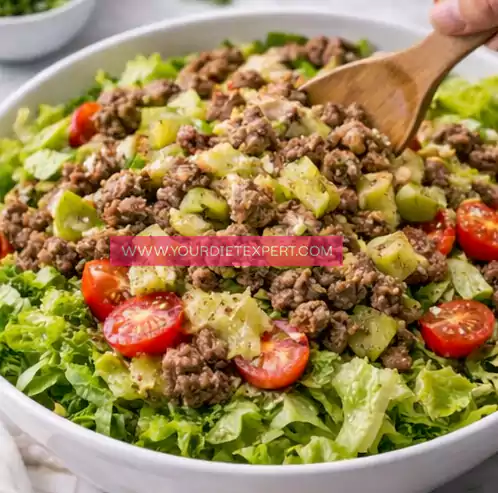 - Spoon the warm, cooked beef evenly over the chopped lettuce. Scatter the chopped pickles across the salad, followed by the shredded cheese, making sure the toppings are distributed evenly so each bite has a mix of savory beef, tangy pickle, and creamy cheese.
