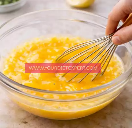 Crack the eggs into a bowl and whisk until fully combined. You want a smooth, uniform mixture without streaks of yolk or white. Light seasoning at this stage ensures the eggs are flavorful on their own.