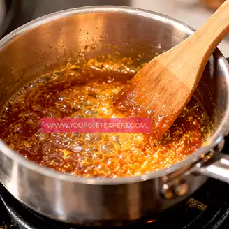 - Add the keto-friendly sweetener and water to a clean saucepan and place it over medium heat. Let it sit undisturbed at first so the sweetener begins to melt evenly. As it starts bubbling, gently swirl the pan (avoid stirring with a spoon) to help it melt uniformly. Keep a close eye on the color—it will slowly turn from clear to light golden, then a deeper amber. This happens quickly, so don’t walk away. The moment you see a rich golden color, remove it from the heat to prevent burning.