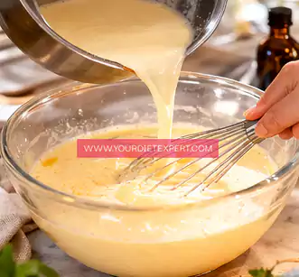 - Slowly begin pouring the warm cream into the egg mixture in a thin, steady stream while whisking continuously. This step is important—pouring too quickly or not whisking can cook the eggs and create lumps. Keep whisking gently but consistently until everything is fully incorporated into a smooth custard base.