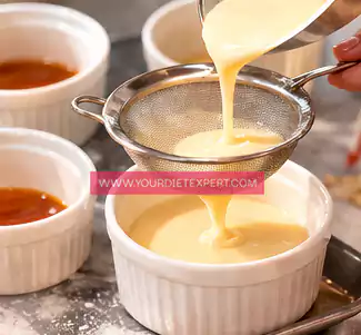 - Place a fine sieve over your ramekins and carefully pour the custard mixture through it. This step removes any bubbles or tiny bits of cooked egg, ensuring your flan turns out ultra-smooth and creamy. Fill each ramekin evenly without overfilling.
