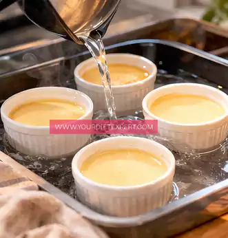- Arrange the filled ramekins in a deep baking tray. Carefully pour hot water into the tray until it reaches about halfway up the sides of the ramekins. This water bath creates gentle, even heat while baking, which helps prevent cracks and keeps the texture delicate.