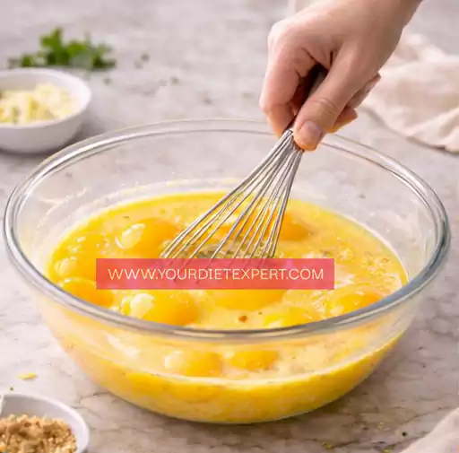 - Crack the eggs into a large mixing bowl. Whisk thoroughly until the yolks and whites are fully combined and the mixture looks smooth and slightly frothy. Take your time here — well-whisked eggs create a lighter, fluffier texture instead of dense, rubbery egg bites.