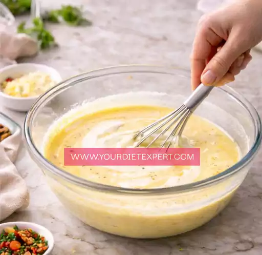 Add the cream and seasonings, whisking again until smooth. The mixture should look uniform, pale yellow, and slightly airy.