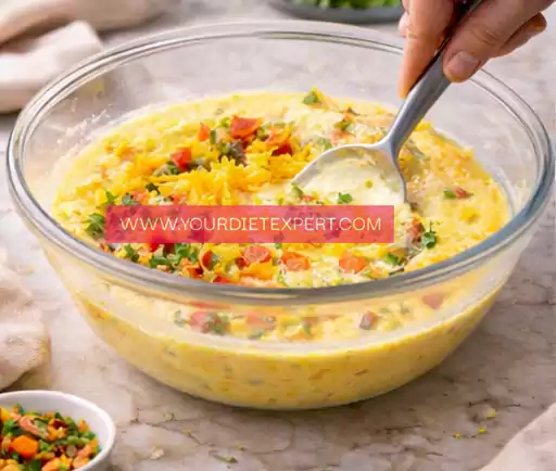 - Add the shredded cheddar cheese and chopped peppers to the bowl. Stir gently with a spatula or spoon until the cheese and peppers are evenly distributed throughout the egg mixture. Avoid aggressive stirring, as you want the eggs to stay airy rather than deflated.