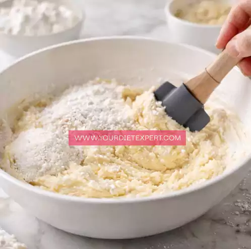 Sprinkle in the almond flour, sweetener, and baking powder. Fold everything together carefully, scraping the sides of the bowl as you go. The dough should look soft and slightly sticky, not stiff or crumbly.