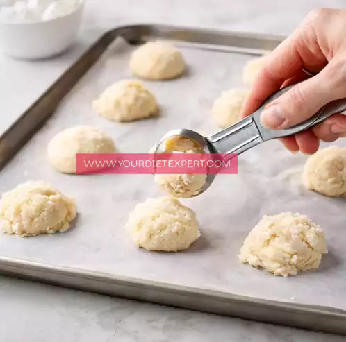 Once your dough is fully mixed, let it rest for a minute or two. This brief pause allows the almond flour to hydrate properly, which helps the cookies hold their shape during baking. Using a spoon or small scoop, portion the dough onto the prepared baking sheet, leaving space between each cookie. The dough will be soft and pillowy, almost like a mousse — that’s exactly what you want.