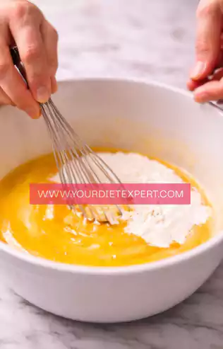 - In a mixing bowl, whisk the egg yolks and powdered sweetener together until the mixture looks smooth and slightly lighter in color. This step helps dissolve the sweetener fully and creates a silky base that won’t turn grainy after baking.