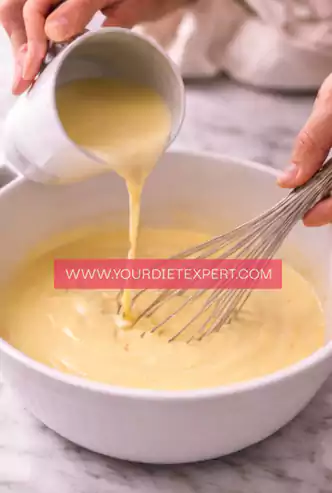 Slowly pour the warm cream into the egg mixture while whisking continuously. This gradual process gently raises the temperature of the eggs without scrambling them. Take your time — slow and steady creates the smoothest custard.