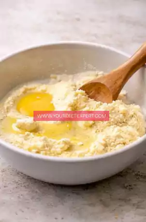 - While the cheese is still warm, add the almond flour, egg, baking powder, and salt into the bowl. Start mixing immediately using a spoon or spatula so the egg incorporates evenly and doesn’t cook from the heat of the cheese.