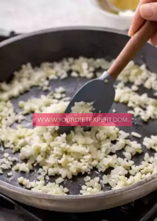 - In the same pan, heat olive oil and sauté the chopped onion until soft and translucent, then add garlic and cook briefly until fragrant.