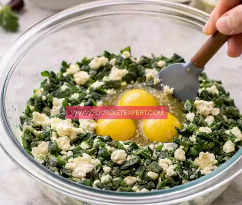 - In a large bowl, combine the drained spinach, onion mixture, feta cheese, eggs, dill, salt, and black pepper, mixing gently until evenly combined.