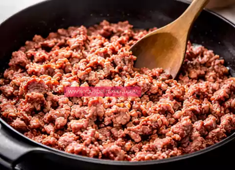 - Add the ground beef to the pan. Use a spatula or wooden spoon to break it apart into small pieces as it cooks. Continue cooking until the beef is fully browned and no longer pink, stirring occasionally for even cooking.