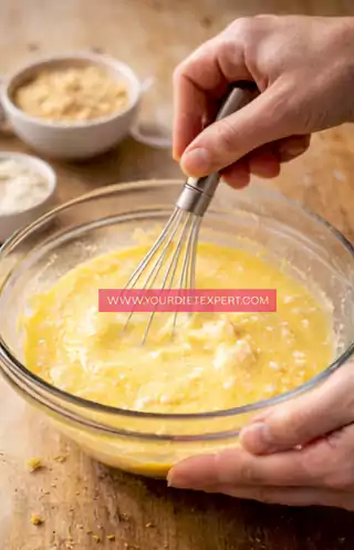 - In a separate bowl, crack the eggs and whisk them thoroughly until slightly frothy, then add Greek yogurt, apple cider vinegar, olive oil, and warm water, mixing until smooth.