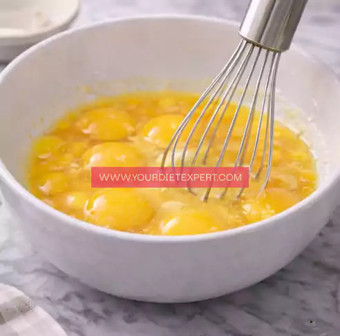 In a large mixing bowl, crack the eggs and whisk them thoroughly until the yolks and whites are fully combined. Whisking well introduces air, which helps create a lighter final texture.