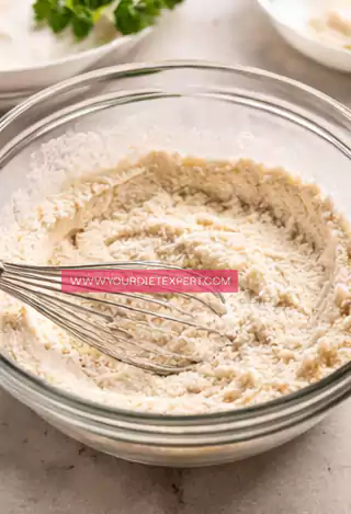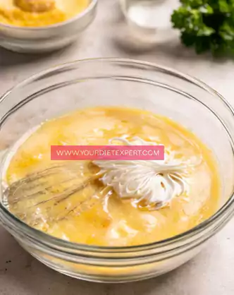 - In a separate bowl, crack in the eggs and whisk them until slightly frothy. Add the Greek yogurt and melted butter, then continue whisking until the mixture becomes smooth, creamy, and fully combined with no streaks remaining.