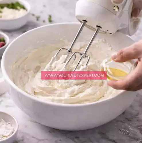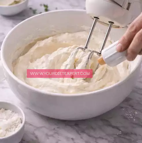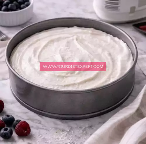Once the cream cheese and coconut yogurt are fully smooth, add the powdered low-carb sweetener and vanilla extract. Mix gently, just until the sweetness is evenly distributed. This is the stage where the cheesecake starts to smell and taste like a dessert rather than a mixture. Take a small taste and adjust sweetness if needed — remember that flavors mellow slightly once chilled, so aim for balanced rather than overly sweet.